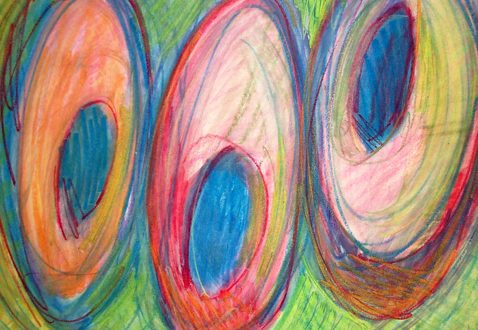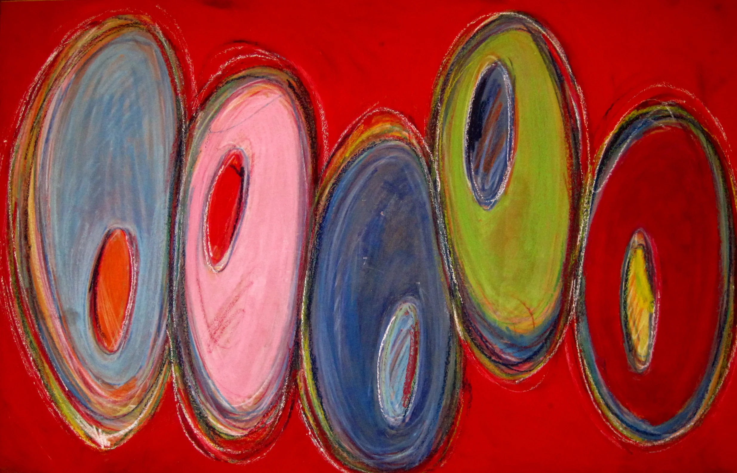 Color, shape, texture and their relationship in forms suggestive of movement, character and life are the focus of this ongoing series. Using oil stick on paper or paint on canvas, this work was created freely and rhythmically, blending color, manipulating line and shape while creating interaction and mood between forms.