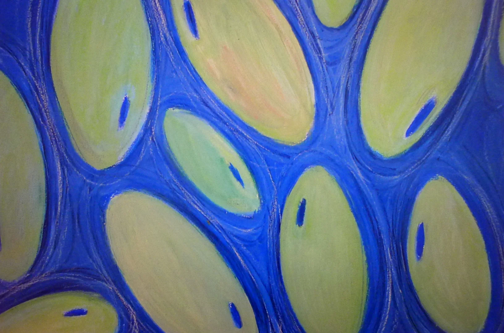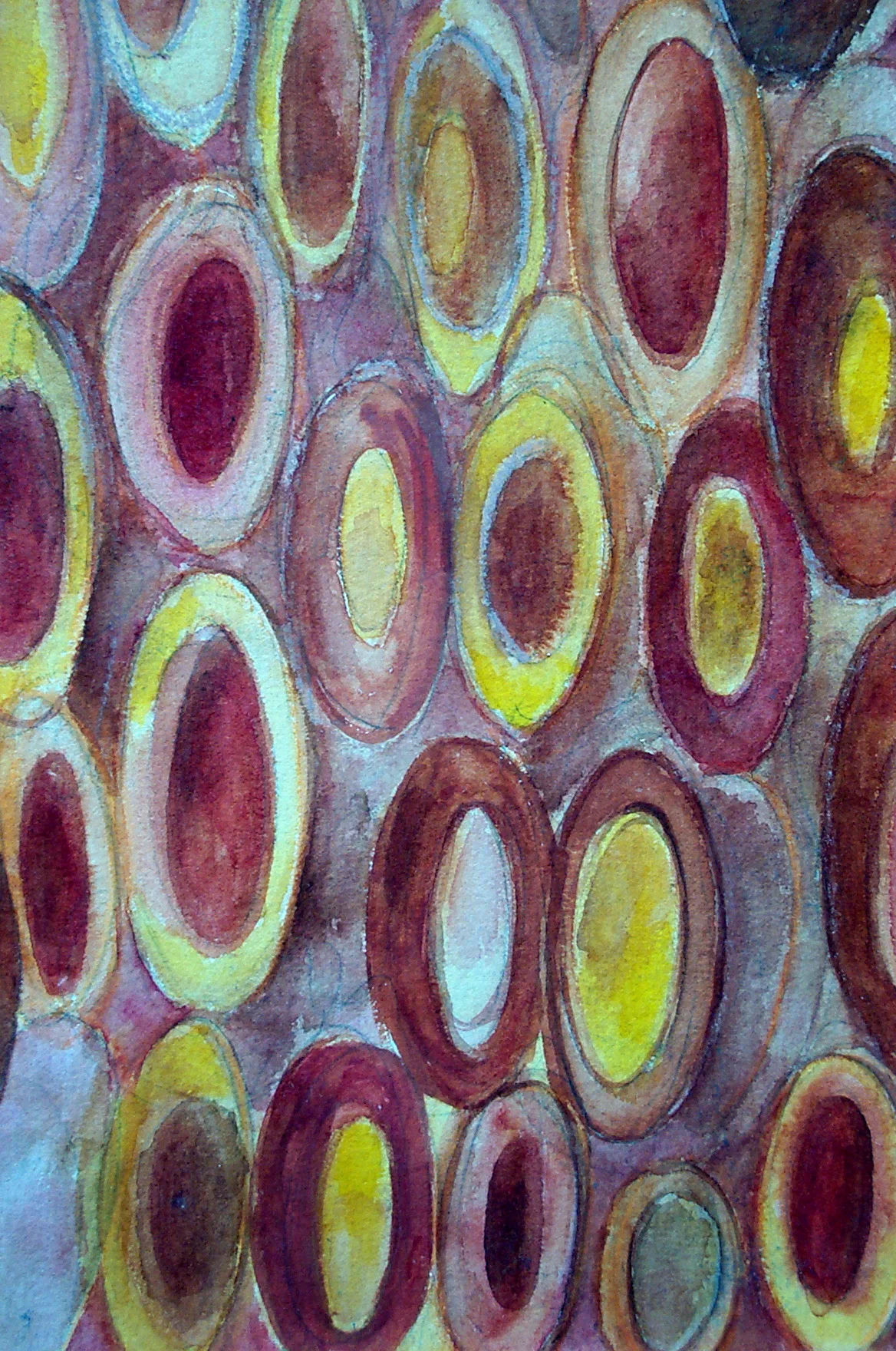 With emphasis on color, sometimes bright and bold, other times subdued, these repeated shapes might suggest a look through a microscope, an enlarged view of a microscopic world and their constantly changing relationship to one another. It is these relationships I find most intriguing and hope to convey the constant movement, ever changing rhythm and fleeting quality of them. Thus the title, Intertwine.